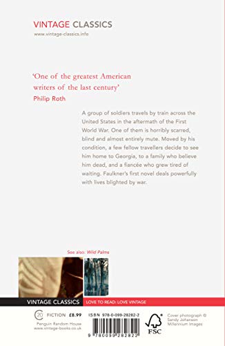 Details: A group of soldiers travel by train across the United States in the aftermath of the First World War. One of them is horribly scarred, blind and almost entirely mute. Moved by his condition, a few civilian fellow travellers decided to see him home to Georgia, to a family who believed him dead, and a fiancée who grew tired of waiting. Faulkner's first novel deals powerfully with lives blighted by war.