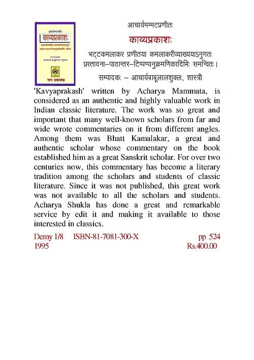 • Title: Kaavyaprakaash (Bhattakamalaakar Pranitayaa Kamalaakari Vyaakhyayaaanugatah Prastaavanaa Paathaantar (Tippanyaanukramanikaadibhih Samanvitah)