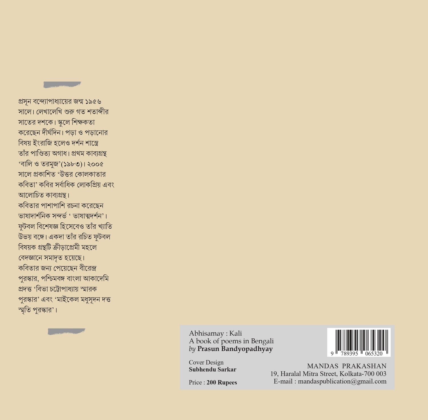 Abhisamay: Kali (Bengali Version) by Prasun Bandyopadhyay, published by Mandas Prakashani in 2023, is a collection of poems that explores the profound themes surrounding the goddess Kali, a powerful symbol of destruction and creation in Hindu mythology. Through 79 pages of evocative poetry, Bandyopadhyay delves into the spiritual, emotional, and cultural dimensions of Kali, embodying her many facets — from her fearsome power to her nurturing and protective presence.