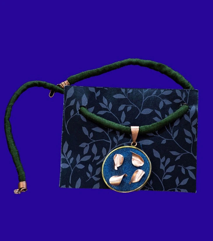 Copper Petals Choker Necklace – Handcrafted Denim & Fiber Pendant with Adjustable Green Cord