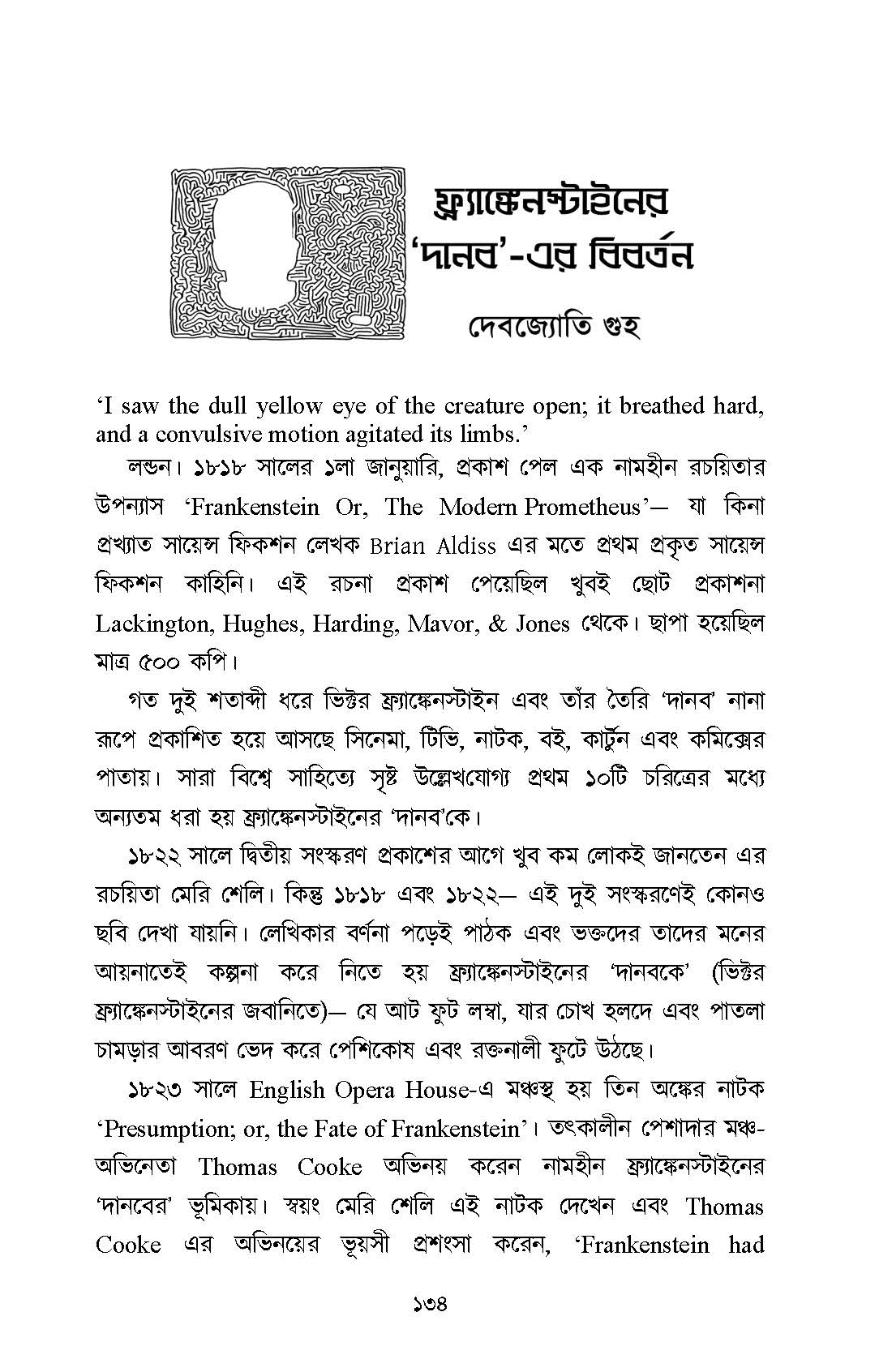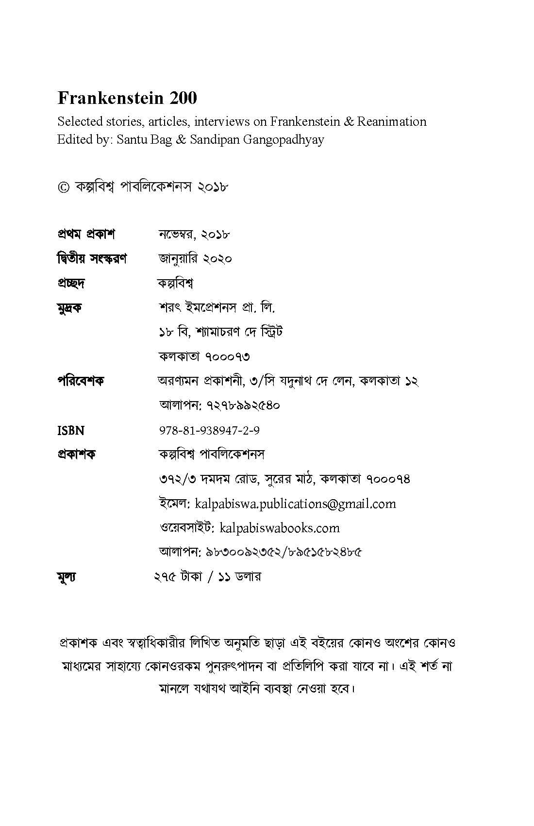 Published to commemorate the bicentennial of Mary Shelley's timeless novel Frankenstein – The Modern Prometheus, Frankenstein 200 is a brilliant tribute from Kalpabiswa Publications. This anthology features a compelling collection of 15 works, including translated foreign stories and original writings by prominent Bengali science fiction authors, all centered around the Frankenstein theme. Blending fiction, essays, interviews, and translations, this book stands as a heartfelt homage from Bengali speculative writers to Mary Shelley. Each piece in this collection offers a unique and thought-provoking take on the iconic Frankenstein legacy.