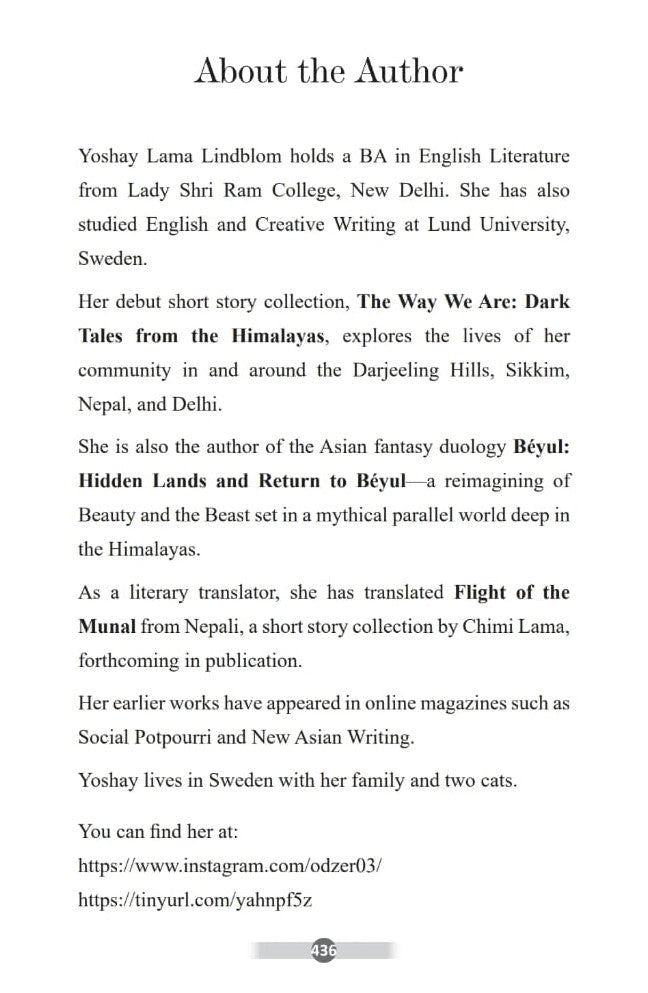 She is also the author of the Asian fantasy duology Beyal: Hidden Lands and Return to Beyul, a reimagining of Beauty and the Beast set in a mythical parallel world deep in the Himalayas.