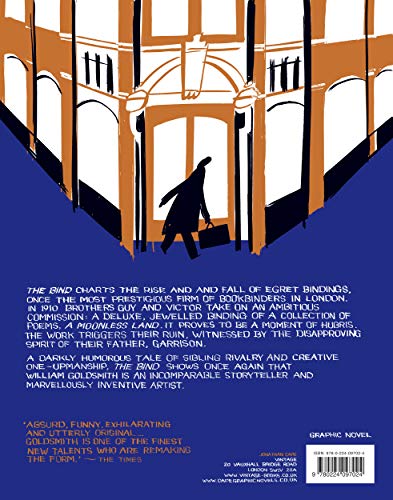 Details: The Bind charts the rise and fall of Egret Bindings, once the most prestigious firm of bookbinders in London.In 1910 brothers Guy and Victor Egret take on an ambitious commission: a deluxe, jewelled binding of a collection of poems, A Moonless Land. It proves to be a moment of hubris. The work triggers their ruin, watched by the disapproving spirit of their father, Garrison Egret.A darkly humorous tale of sibling rivalry and creative one-upmanship, The Bind shows once again that William Goldsmith is an incomparable storyteller and a marvellously inventive artist.