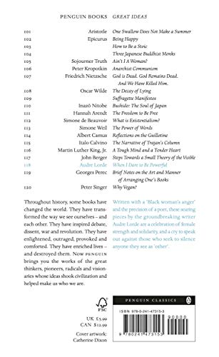 Details: Written with a 'black woman's anger' And the precision of a poet, these searing pieces by the ground-breaking writer audre lorde are a celebration of female strength and solidarity, and a cry to speak out against those who seek to silence anyone they see as 'other'. Great ideas. Throughout history, some books have changed the world. They have transformed the way we see ourselves - and each other. They have inspired debate, dissent, war and revolution. They have enlightened, br>Outraged, provoked and comforted. They have enriched lives - and destroyed them. Now Penguin brings you the works of the great thinkers, pioneers, Radicals and visionaries whose ideas shook civilization and helped make us who we are.