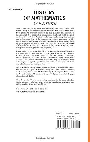 Details: Within this two-volume edition, Professor Smith covers the entire history of mathematics in the Near and Far East and the West, from primitive number concepts to the calculus. His account is distinguished by impeccable scholarship combined with unusual clarity and readability. Footnotes add many technical points outside the book's actual line of development and direct the reader to disputed matters and source readings. Hundreds of illustrations from Egyptian papyri, Hindu, Chinese, and Japanese manuscripts, Greek and Roman texts, Medieval treatises, maps, portraits, etc. are used along with modern graphs and diagrams.Every major figure from Euclid to Descartes, Gauss, and Riemann and hundreds of lesser-known figures &; Theon of Smyrna, Rabbi ben Ezra, Radulph of Laon, Mersenns, Benedetti, and more &; are considered both with respect to specific problems and with an awareness of their overall influence on mathematics.Volume II: Special Topics, considering mathematics in terms of arithmetic geometry, algebra, trig, calculus, calculating machines, and other specific fields and problems. 192 Topics for Discussion. 195 illustrations. Index.