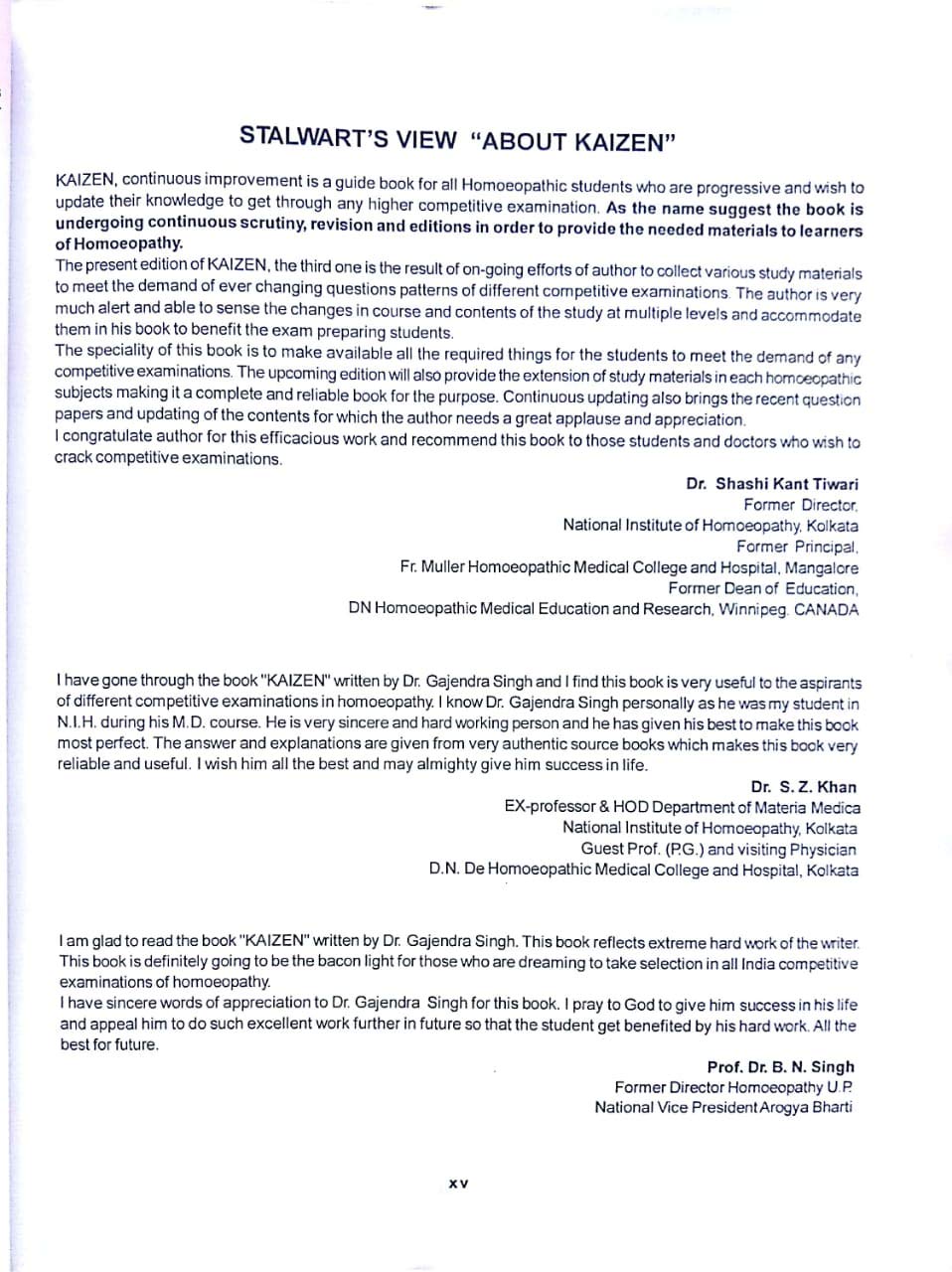 Details: KAIZEN is a comprehensive MCQ guide aimed at helping students preparing for various competitive exams in homoeopathy, including UPSC, State PSCs, and MD entrance exams. The book is organized by topic, with each multiple choice question followed by an authentic explanation and reference. It includes tables for comparison, flow charts, and additional "Little More" information to clarify doubts and improve understanding. The author emphasizes repetition for better retention of key concepts. Model questions for self-evaluation are provided to help students assess their progress. This book is designed to simplify difficult topics, making it easier for students to differentiate between options and choose the correct answer. It is a valuable resource for exam preparation in homoeopathy, consolidating years of previous exam questions into one comprehensive guide.