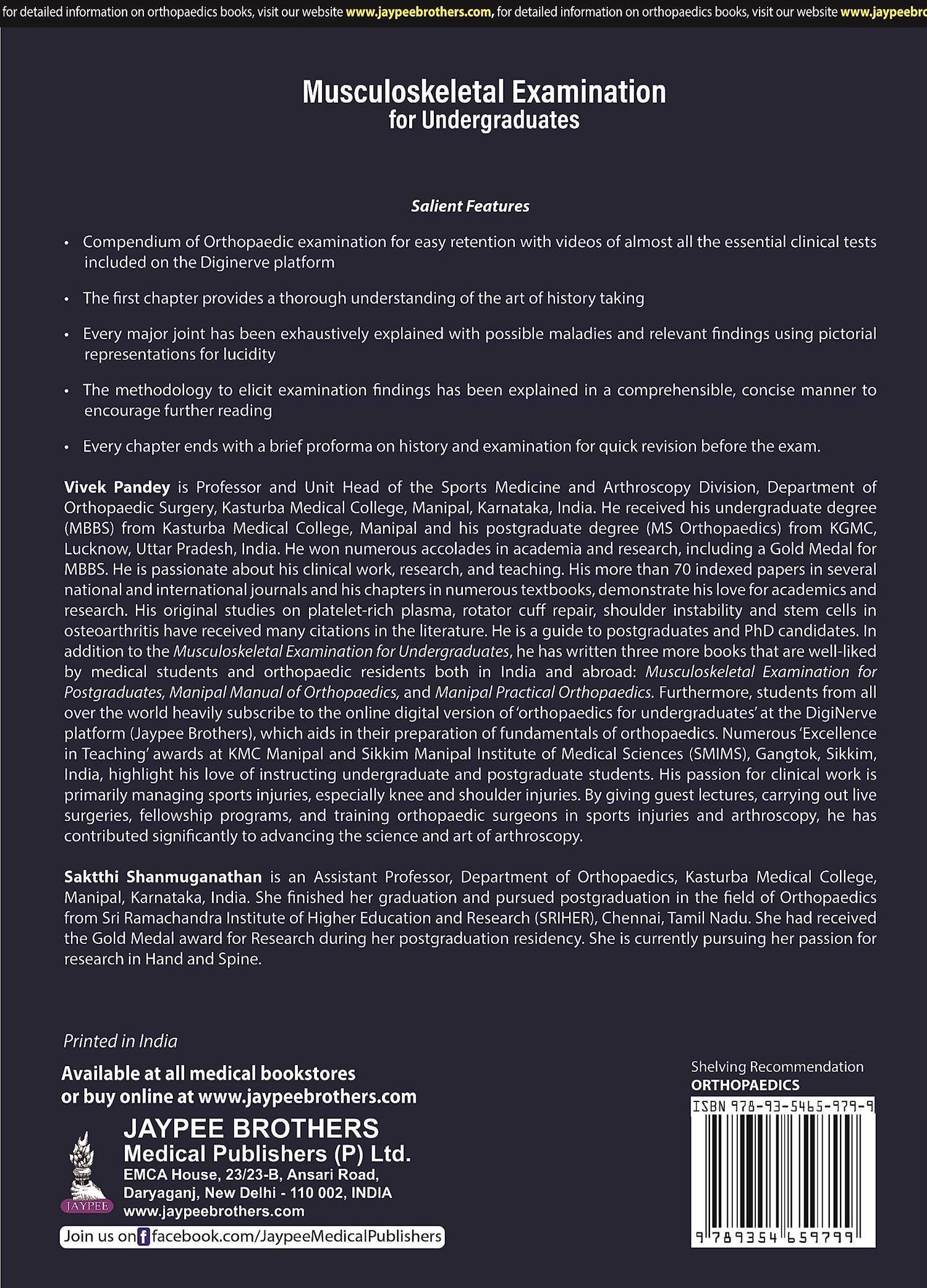 Details: "Compendium of Orthopaedic examination for easy retention with videos of almost all the essential clinical tests included on the Diginerve platform. The first chapter provides a thorough understanding of the art of history taking. Every major joint has been exhaustively explained with possible maladies and relevant findings using pictorial representations for lucidity. The methodology to elicit examination findings has been explained in a comprehensible, concise manner to encourage further reading. Every chapter ends with a brief proforma on history and examination for quick revision before the exam."