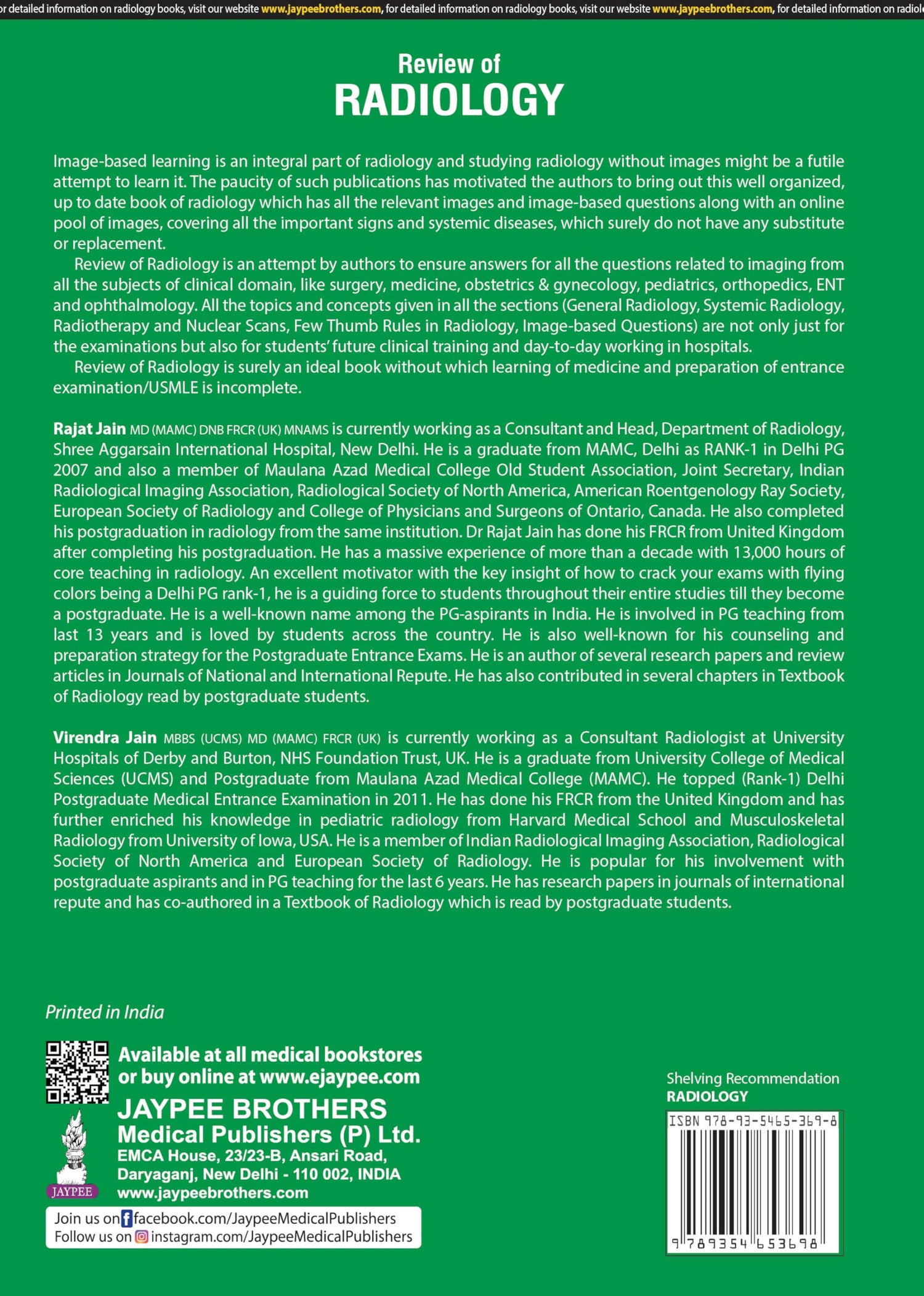Details: Image-based learning is an integral part of radiology and studying radiology without images might be a futile attempt to learn it. The paucity of such publications has motivated the authors to bring out this well organized, up to date book of radiology which has all the relevant images and image-based questions along with an online pool of images, covering all the important signs and systemic diseases, which surely do not have any substitute or replacement. Review of Radiology is an attempt by authors to ensure answers for all the questions related to imaging from all the subjects of clinical domain, like surgery, medicine, obstetrics & gynecology, pediatrics, orthopedics, ENT and ophthalmology. All the topics and concepts given in all the sections (General Radiology, Systemic Radiology, Radiotherapy and Nuclear Scans, Few Thumb Rules in Radiology, Image-based Questions) are not only just for the examinations but also for students'future clinical training and day-to-day working in hospitals. Review of Radiology is surely an ideal book without which learning of medicine and preparation of entrance examination/USMLE is incomplete.