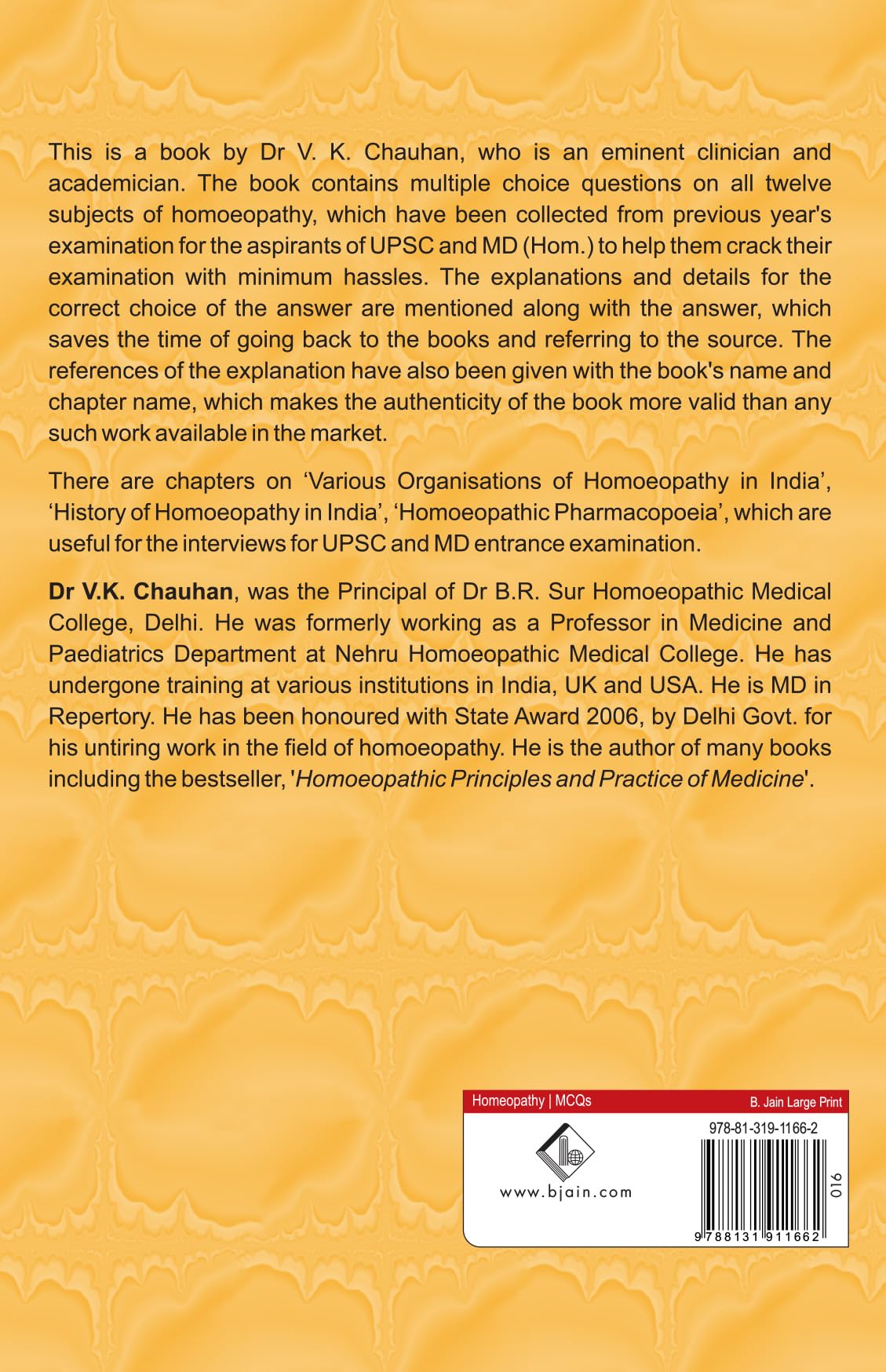 Details: This comprehensive book by Dr. V.K. Chauhan, a renowned clinician and academician, contains over 3000 multiple-choice questions on all twelve subjects of homeopathy, collected from previous year's examinations. It is designed for aspirants of UPSC and MD (Hom.) exams, helping students prepare efficiently for their exams. Along with the MCQs, the book offers explanations for the correct answers, saving time for students by eliminating the need to refer back to other books. The book also includes chapters on the history of homeopathy in India, homoeopathic pharmacopoeia, and various homeopathic organizations, which are useful for UPSC and MD entrance interviews. Additionally, it provides helpful notes highlighting common mistakes made by students in exams, and strategies to avoid them, boosting their performance.