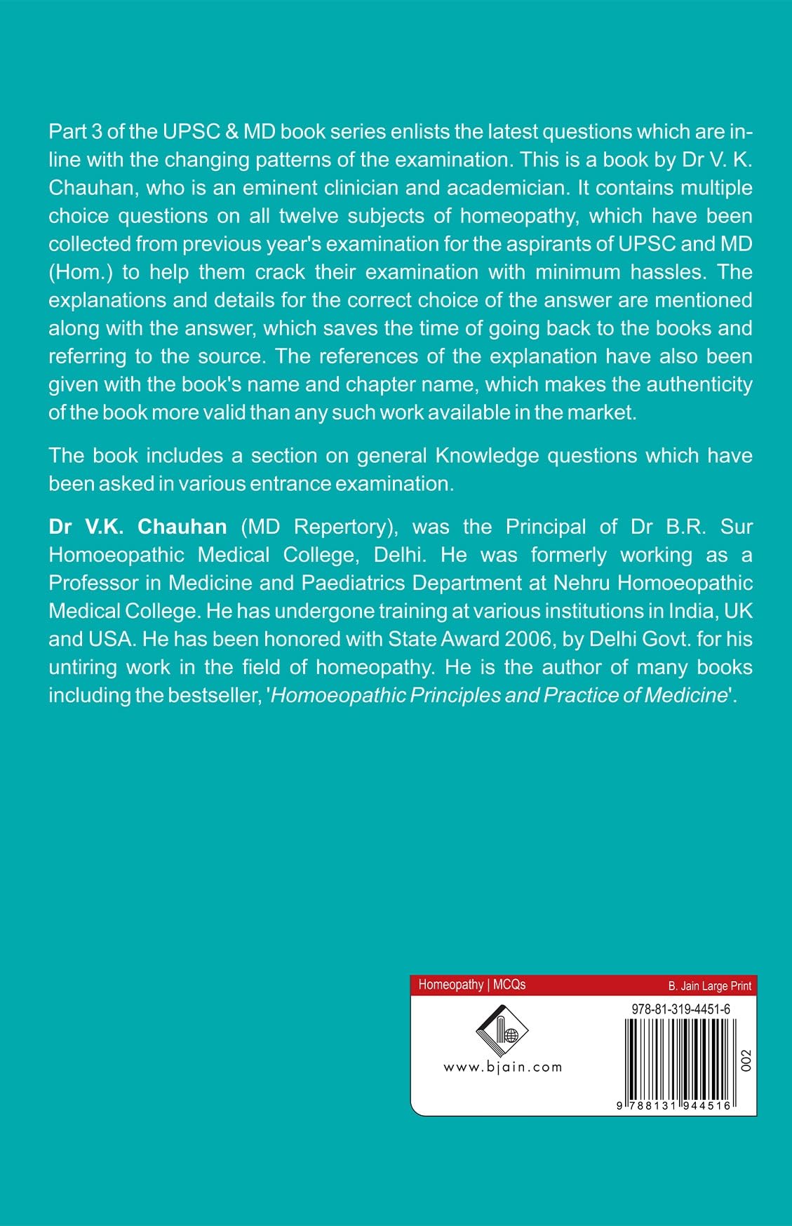 • Details: This book, Part 3 of the UPSC & MD book series by Dr. V.K. Chauhan, is designed to help aspirants of UPSC and MD (Hom.) exams by providing multiple choice questions across all homeopathic subjects and allied topics taught during the four and a half years of study. It includes questions based on the latest exam patterns and previous year's questions, making it a valuable resource for exam preparation. The book offers detailed explanations for the correct answers, along with references to the source material, saving time and ensuring authenticity. It also contains a section on general knowledge questions asked in various entrance examinations. The explanations and answers have been thoroughly checked for accuracy to provide the most reliable study material.