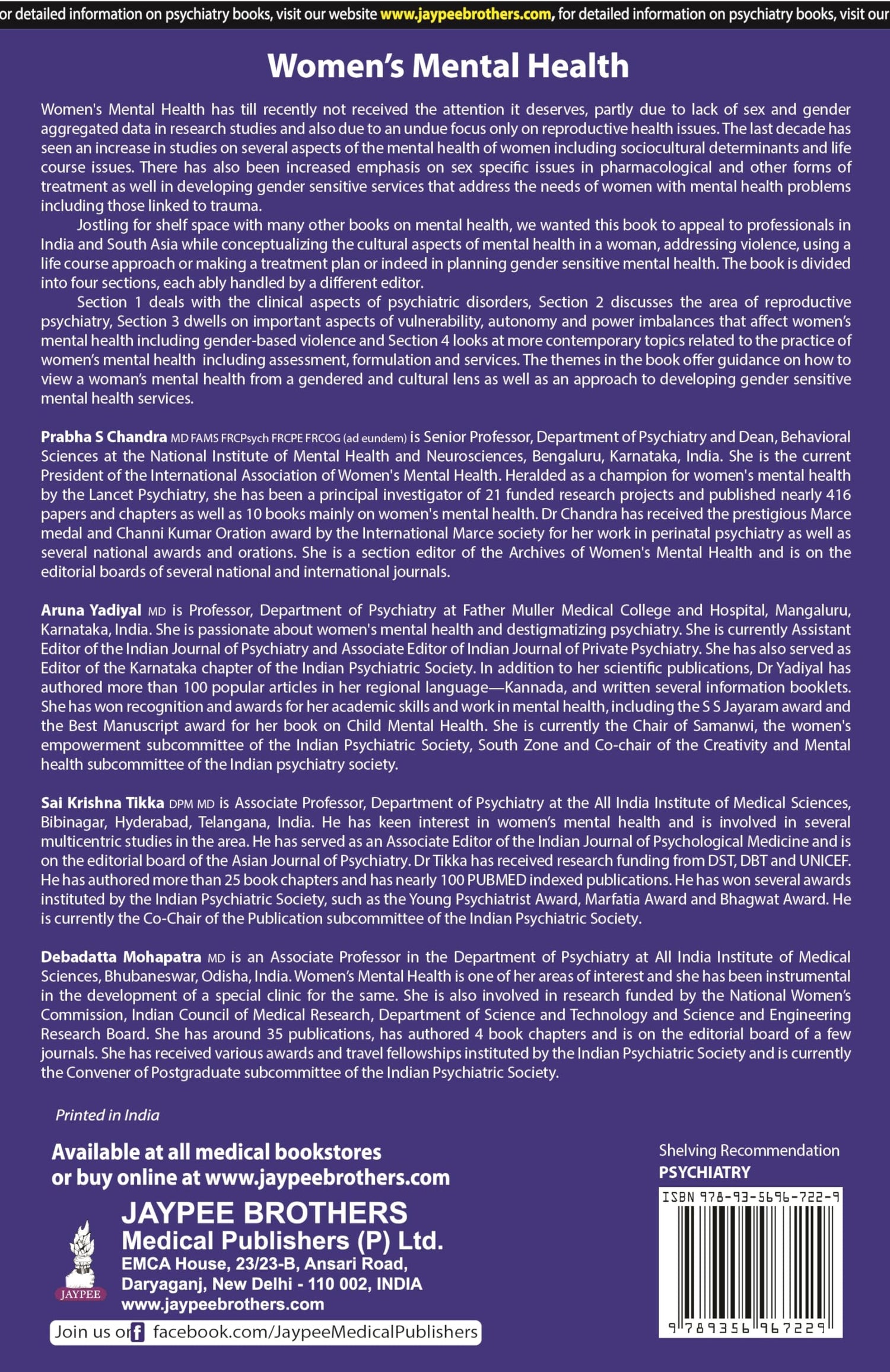 Details: "The book is divided into four sections, each ably handled by a different editor. Section 1 deals with the clinical aspects of psychiatric disorders. Section 2 discusses the area of reproductive psychiatry. Section 3 dwells on important aspects of vulnerability, autonomy and power imbalances that affect women's mental health including gender-based violence. Section 4 looks at more contemporary topics related to the practice of women's mental health including assessment, formulation and services. The themes in the book offer guidance on how to view a woman's mental health from a gendered and cultural lens as well as an approach to developing gender sensitive mental health services."