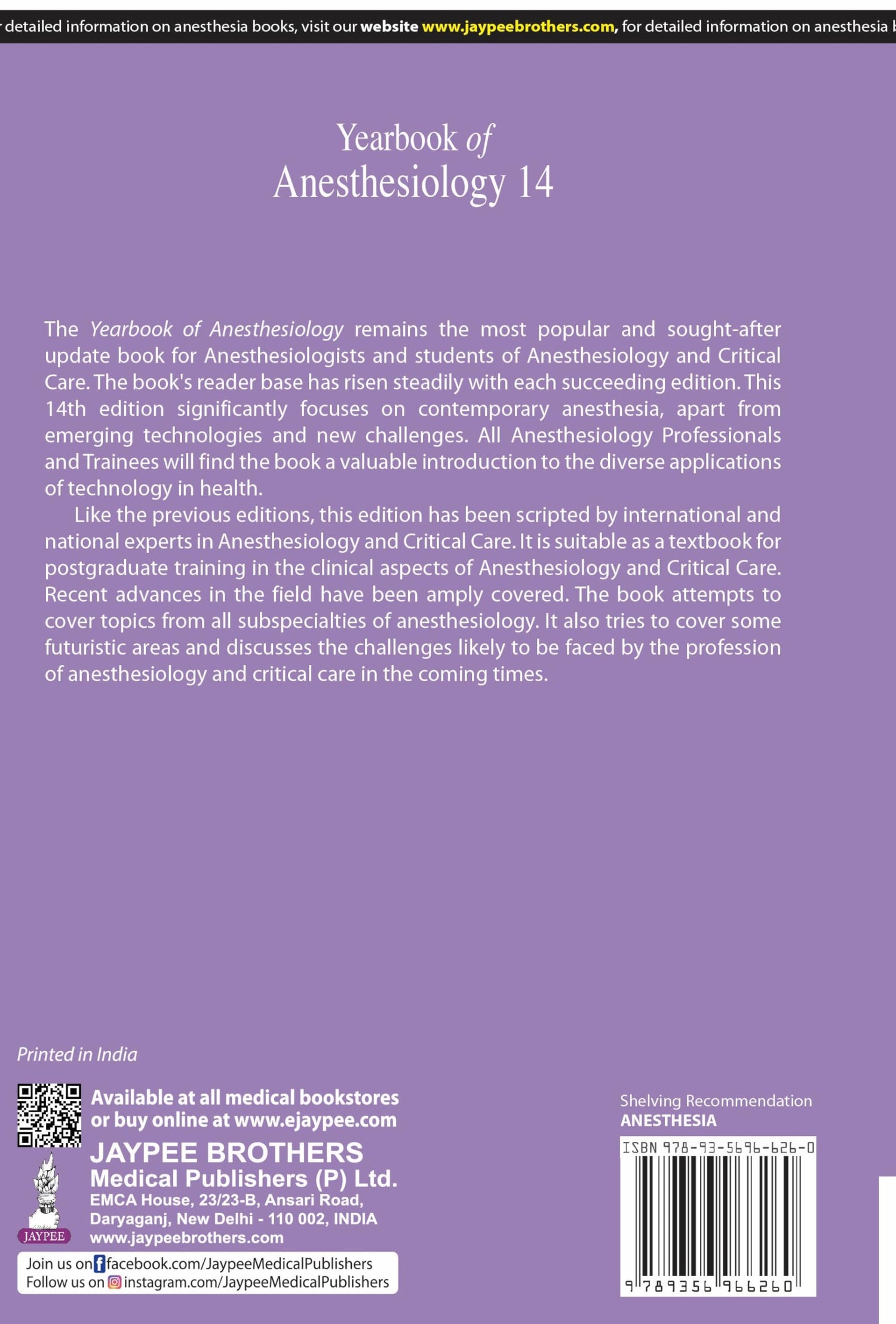 Details: The Yearbook of Anesthesiology remains the most popular and sought-after update book for Anesthesiologists and students of Anesthesiology and Critical Care. The book's reader base has risen steadily with each succeeding edition. This 14th edition significantly focuses on contemporary anesthesia, apart from emerging technologies and new challenges. All Anesthesiology Professionals and Trainees will find the book a valuable introduction to the diverse applications of technology in health. Like the previous editions, this edition has been scripted by international and national experts in Anesthesiology and Critical Care. It is suitable as a textbook for postgraduate training in the clinical aspects of Anesthesiology and Critical Care. Recent advances in the field have been amply covered. The book attempts to cover topics from all subspecialties of anesthesiology. It also tries to cover some futuristic areas and discusses the challenges likely to be faced by the profession of anesthesiology and critical care in the coming times.