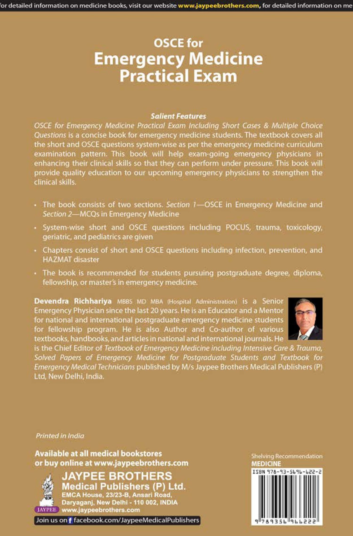 Details: The medical education system adopts various methods of assessment for evaluation of their students like theoretical and Objective Structured Clinical Examination (OSCE). OSCEs are a highly effective tool in medical education evaluation because they allow a student to practice and demonstrate clinical skills in a standardized medical scenario. An OSCE is a framework consisting of multiple stations, an approach to the assessment of clinical competence, assessed in a planned or structured way. Medical students need to develop strong clinical skills, effective communication, and the ability to perform under pressure for clearing the OSCE examinations. Few important tips need to be followed by the medical students to clear the OSCE, such as get your basic right, stay focused, know your weakness and strength, achieve confidence and perfection with practice…practice…and practice. This book will help the medical students in achieving strong clinical skills. This book will provide quality education to our upcoming emergency physicians to strengthen the clinical skills. The book consists of two sections – Section 1—OSCE in Emergency Medicine Section 2—MCQs in Emergency Medicine System-wise short and OSCE questions including POCUS, trauma, toxicology, geriatric, and pediatrics are given. Chapters consist of short and OSCE questions including infection, prevention, and HAZMAT disaster. The book is recommended for students pursuing postgraduate degree, diploma, fellowship, or master’s in emergency medicine.