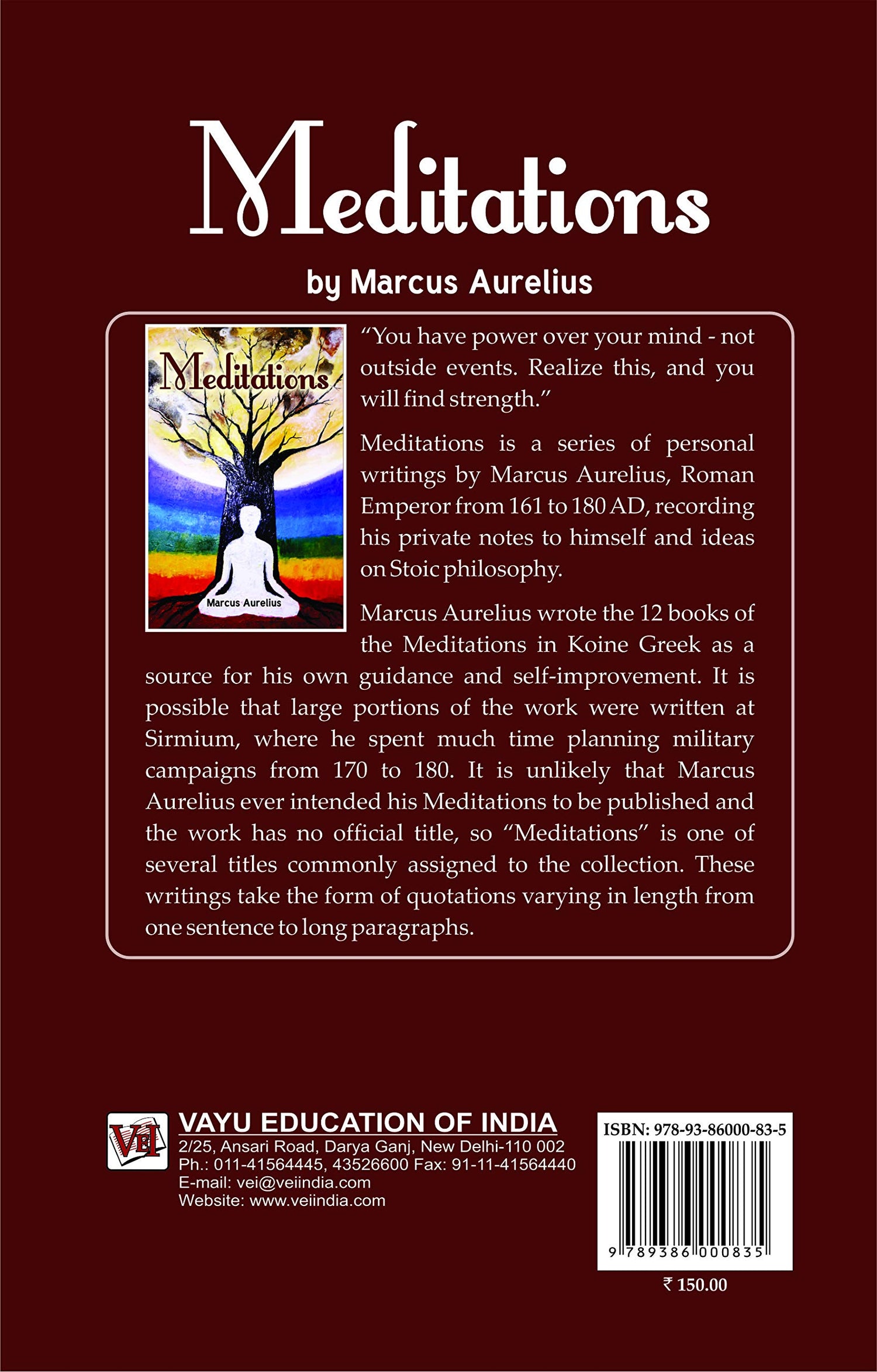 Details: "You have power over your mind - not outside events. Realize this, and you will find strength." Meditations is a series of personal writings by Marcus Aurelius, Roman Emperor from 161 to 180 AD, recording his private notes to himself and ideas on Stoic philosophy. Marcus Aurelius wrote the 12 books of the Meditations in Koine Greek as a source for his own guidance and self-improvement. It is possible that large portions of the work were written at Sirmium, where he spent much time planning military campaigns from 170 to 180. It is unlikely that Marcus Aurelius ever intended his Meditations to be published and the work has no official title, so "Meditations" is one of several titles commonly assigned to the collection. These writings take the form of quotations varying in length from one sentence to long paragraphs.