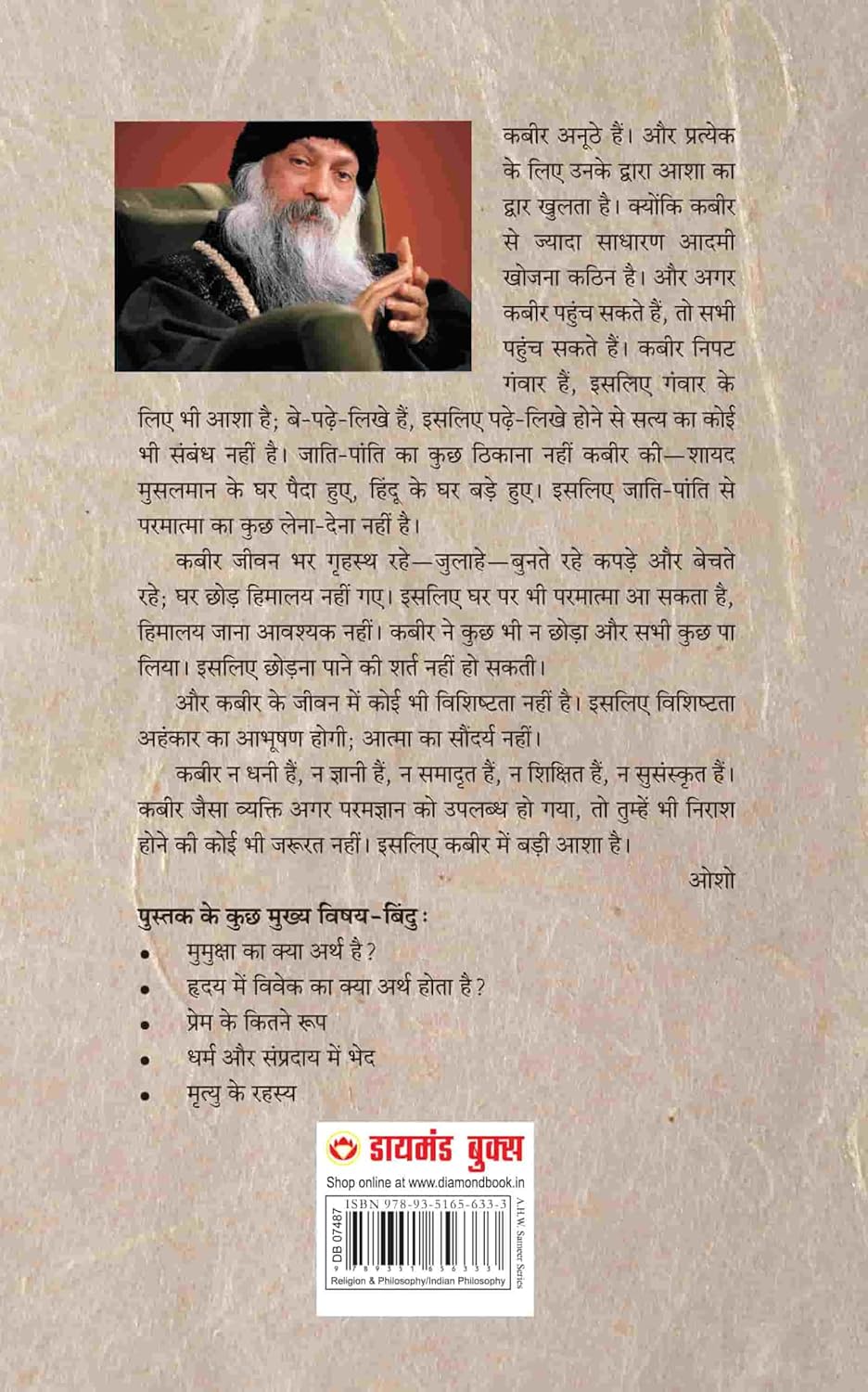Details: कबीर अनूठे हैं और प्रत्येक के लिए उनके द्वारा आशा का द्वार खुलता है। क्योंकि कबीर से ज्यादा साधारण आदमी खोजना कठिन है। और अगर कबीर पहुंच सकते हैं, तो सभी पहुंच सकते हैं। कबीर निपट गंवार हैं, इसलिए गंवार के लिए भी आशा है, बे-पढ़े-लिखे हैं, इसलिए पढ़े-लिखे होने से सत्य का कोई भी संबंध नहीं है। जाति-पांति का कुछ ठिकाना नहीं कबीर की-शायद मुसलमान के घर पैदा हुए, हिंदू के घर बड़े हुए। इसलिए जाति-पांति से परमात्मा का कुछ लेना-देना नहीं है। कबीर जीवन भीर गृहस्थ रहे-जुलाहे-बुनते रहे कपड़े और बेचते रहे, घर छोड़ हिमालय नहीं गए। इसलिए घर पर भी परमात्मा आ सकता है, हिमालय जाना आवश्यक नहीं। कबीर ने कुछ भी न छोड़ा और सभी कुछ पा लिया। इसलिए छोड़ना पाने की शर्त नहीं हो सकती। और कबीर के जीवन में काई भी विशिष्टता नहीं है। इसलिए विशिष्टता अहंकार का आभूषण होगी, आत्मा का सौंदर्य नहीं। कबीर न धनी हैं, न ज्ञानी हैं, न समादृत हैं, न शिक्षित हैं, न सुसंस्कृत हैं। कबीर जैसा व्यक्ति अगर परमज्ञान को उपलब्ध हो गया, तो तुम्हें भी निराश होने की कोई भी जरूरत नहीं। इसलिए कबीर में बड़ी आशा है।-ओशोपुस्तक के कुछ मुख्य विषय-बिंदुःमुमुक्षा का क्या अर्थ है?हृदय में विवेक का क्या अर्थ होता है।प्रेम के कितने रूपधर्म और संप्रदाय में भेदमृत्यु के रहस्य