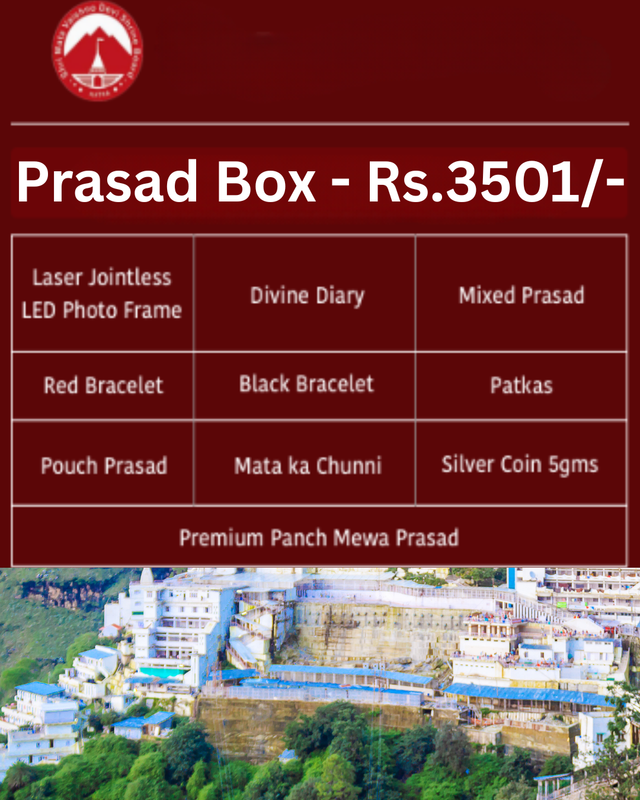 Experience the power of pure devotion. Order your Shri Mata Vaishno Devi Ji Prasad Box (₹3001/-) now and receive the blessings of the Goddess at your doorstep.