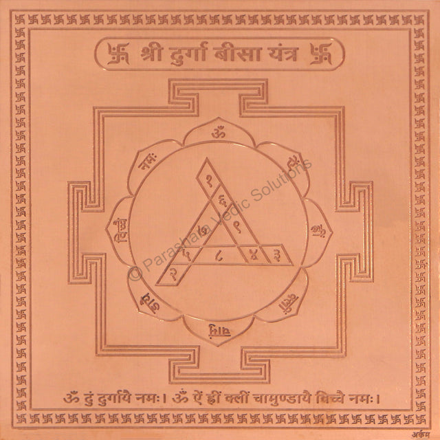 The Arkam Durga Beesa Yantra in copper (6 x 6 inches, brown) is a sacred spiritual tool dedicated to Goddess Durga, renowned for protection, prosperity, and success. This Yantra is believed to invite wealth, safeguard against enemies, and shield the worshipper from unwanted problems and negative influences. It effectively prevents poverty, enhances health, stops bad dreams, and helps fulfill desires. Widely favored by businessmen, it ensures financial success while providing protection and removing obstacles in life. Perfect for homes, offices, or personal altars, the Durga Beesa Yantra harmonizes spiritual energy with practical benefits, offering both divine blessing and everyday support.
