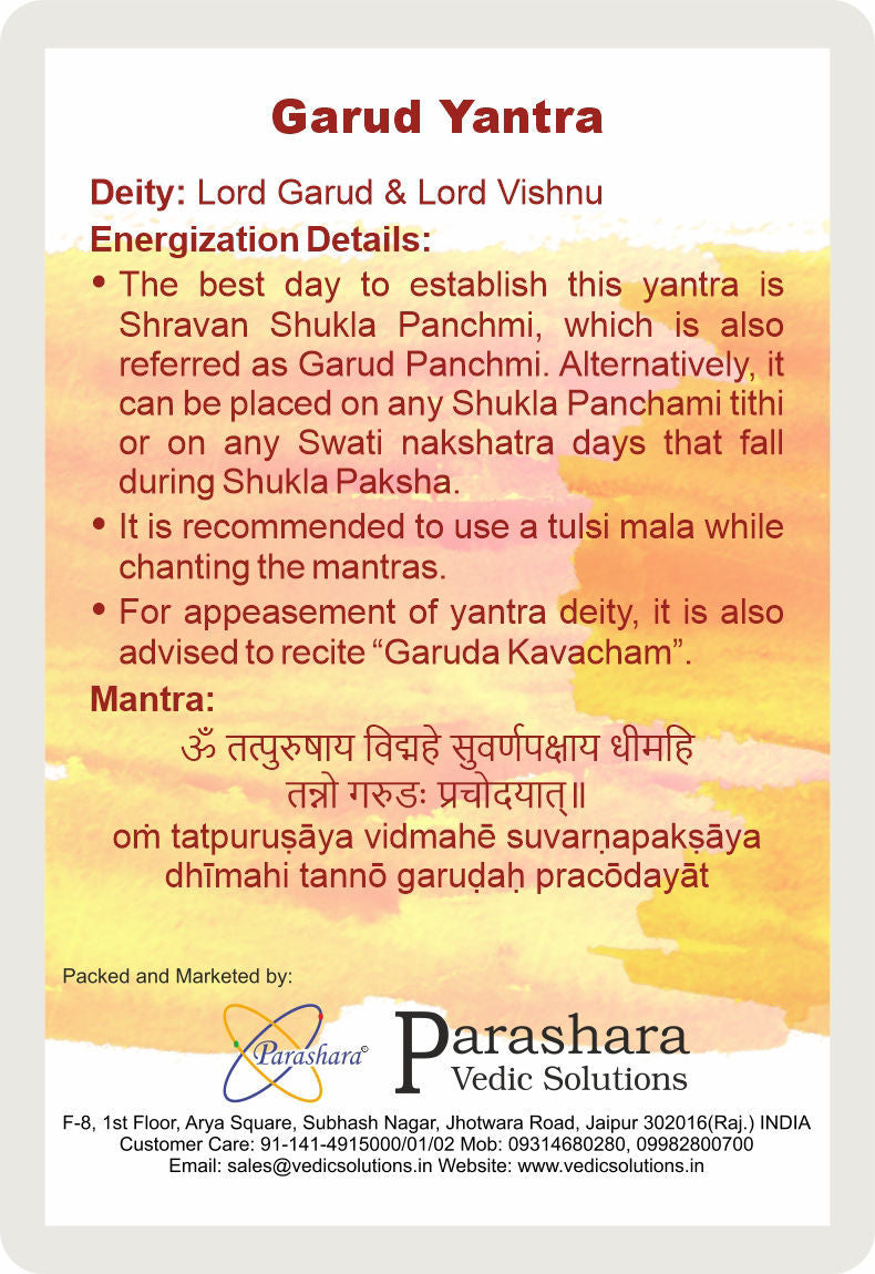 This yantra enhances Vahan Bhagya, empowering devotees to acquire vehicles of their choice and ensuring safe, worry-free travels. It alleviates problems caused by adverse planetary positions of Rahu and Ketu, including financial losses, anxiety, lack of savings, separation from home, slow progress, and displeasure from superiors. Worshipping the Garud Yantra promotes personal growth, knowledge, confidence, and respect. Ideal for homes, offices, or vehicles, it creates a protective, prosperous, and harmonious environment.