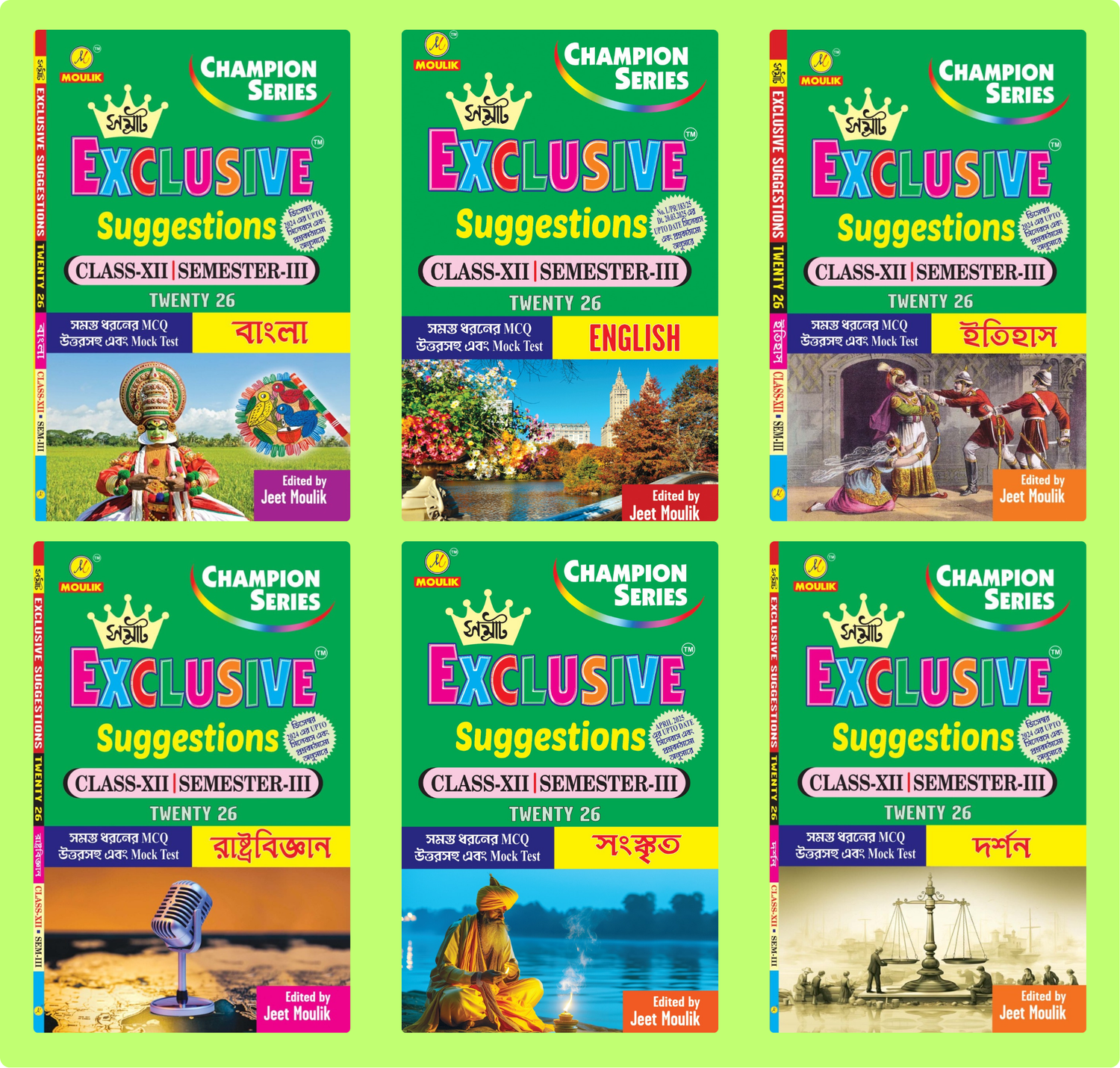 The 3rd Semester Class 12 Samrat Exclusive Suggestion series by Jeet Moulik is a comprehensive collection designed to support students preparing for their 12th-grade examinations in the West Bengal education system. This series includes a variety of book sets, covering subjects such as Bengali, English, History, Geography, Political Science, Computer Science, Physics, Chemistry, Biology, Maths, Sanskrit, Darshan, Education, and more.