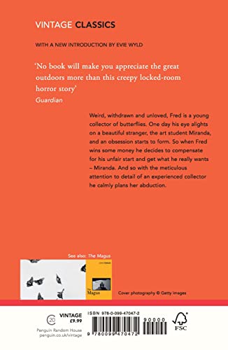 Weird, withdrawn, and unloved, Fred is a young collector of butterflies. One day his eye alights on a beautiful stranger, the art student Miranda, and an obsession starts to form. So when Fred wins some money he decides to use the money to compensate for his unfair start and to get what he really wants - Miranda. If she could only get to know him she might start to love him. And so with the meticulous attention to detail of an experienced collector he calmly plans her abduction.