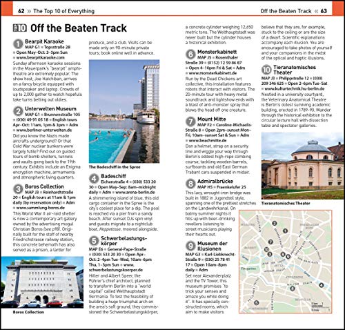 Details: An unbeatable, pocket-sized guide to Berlin, packed with insider tips and ideas, color maps, top 10 lists, and a laminated pull-out map--all designed to help you see the very best of Berlin.Stroll along Unter den Linden, experience a world-class orchestral performance at the Philharmonie, take in the Baroque gardens of the Schloss Charlottenburg, or visit the cool cafés in Prenzlauer Berg. From Top 10 art galleries to Top 10 lounges and clubs--discover the best of Berlin with this easy-to-use travel guide.Inside Top 10 Berlin:- Twelve easy-to-follow itineraries, perfect for a day trip, a weekend, or a week- Top 10 lists showcase the best attractions in Berlin, covering Brandenburger Tor and Pariser Platz, the Reichstag, Museumsinsel, Kurfürstendamm, Kulturforum, and more- Free laminated pull-out map of Berlin, plus ten full-color area maps- In-depth area guides explore Berlin's most interesting neighborhoods, with the best places for shopping, going out, and sightseeing - Color-coded chapters divided by area make it easy to find information quickly and plan your day - Essential travel tips including our expert choices of where to stay, eat, shop, and sightsee, plus useful transportation, visa, and health information- Color maps help you navigate with ease - Covers Central Berlin: Unter den Linden; Central Berlin: Scheunenviertel; Central Berlin: Around Alexanderplatz; The Tiergarten and Federal District; Charlottenburg and Spandau; Kreuzberg, Schöneberg, and Neukölln; Prenzlauer Berg; Berlin's Southeast; Grunewald and Dahlem; Potsdam and SanssouciStaying longer and looking for a more comprehensive guide to Berlin? Try our DK Eyewitness Travel Guide Berlin.About DK Eyewitness Travel: DK's Top 10 guides take the work out of planning a short trip, with easy-to-read maps, tips, and tours to inform and enrich your weekend trip or cultural vacation. DK is the world's leading illustrated reference publisher, producing beautifully designed books for adults and children in over 120 countries.
