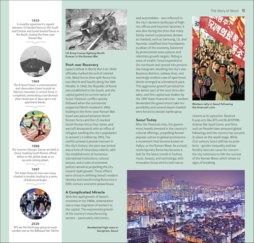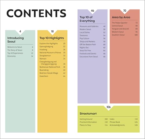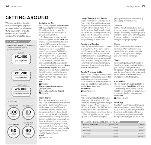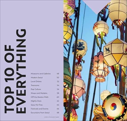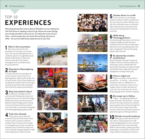 • Detailed Top 10 lists of Seoul's must-sees, including comprehensive descriptions of the Gyeongbok, Changdeok and Changgyeong palaces, the fascinating neighbourhoods of Insadong, Dongdaemun and Buamdong; the National Museum of Korea, Nam Mountain, Bukhansan National Park, Bukchon Hanok Village, and the nearby city of Gwacheon