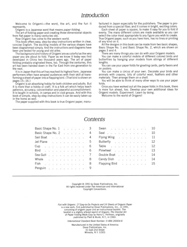 Details: For centuries, the ancient Japanese folk art of paperfolding &; origami &; has helped teach patience, accuracy and concentration. It remains a rewarding and fascinating hobby for young and old alike. This easy-to-follow introduction offers origami enthusiasts 17 different projects &; all pre-tested and graded according to difficulty.Simple instructions, over 100 clearly drawn diagrams, and a supply of authentic origami paper (24 sheets, each 7" x 7", in 12 different colors) help beginners master such simple shapes as a sail boat, jet plane, and paper cup. Intermediate-level paperfolders may find the bird, whale, fish, and penguin more appropriate for their skills, while veteran origamists can enjoy the challenge of creating a seal, butterfly, flapping hand, and other figures.