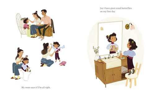 As she and her mom make their way to school, Mom explains how the butterflies are a good thing. Everyone gets them (including parents) and they are a sign of something exciting happening—that we're about to learn and grow from a new experience and they can help us through it.