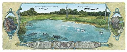 As they swim across a pond, push through a thicket of reeds, leap over a huge anthill, a menagerie of exotic animals passes the news along in a kind of animal Bush Telegraph. Finally Badger faces a lift-the-flap page, revealing the twist that teaches Badger a lesson. Can you guess who's under that flap?