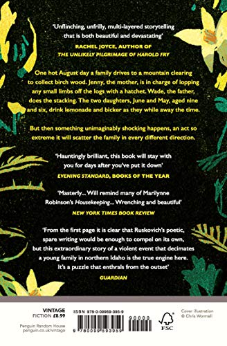 One hot August day a family drives to a mountain clearing to collect birch wood. Jenny, the mother, is in charge of lopping any small limbs off the logs with a hatchet. Wade, the father, does the stacking. The two daughters, June and May, aged nine and six, drink lemonade, swat away horseflies, bicker, sing snatches of songs as they while away the time.