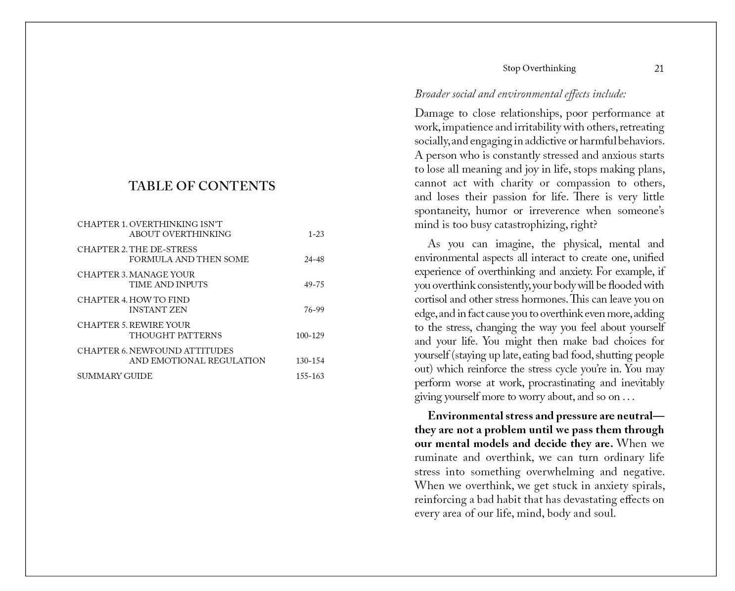 Stop Overthinking is a book that understands the exhausting situation you've put yourself in, and how you lose your mind with anxiety and stress. It will walk you through detailed and proven techniques to help rewire your brain, control your thoughts, and change your mental habits.