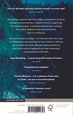 Fiona Maye is a leading High Court judge, presiding over cases in the family court. She is renowned for her fierce intelligence, exactitude and sensitivity. But her professional success belies private sorrow and domestic strife. There is the lingering regret of her childlessness, and now, her marriage of thirty years is in crisis.At the same time, she is called on to try an urgent case: for religious reasons, a beautiful seventeen-year-old boy, Adam, is refusing the medical treatment that could save his life, and his devout parents share his wishes. Time is running out. Should the secular court overrule sincerely held faith? In the course of reaching a decision Fiona visits Adam in hospital – an encounter which stirs long-buried feelings in her and powerful new emotions in the boy. Her judgment has momentous consequences for them both.