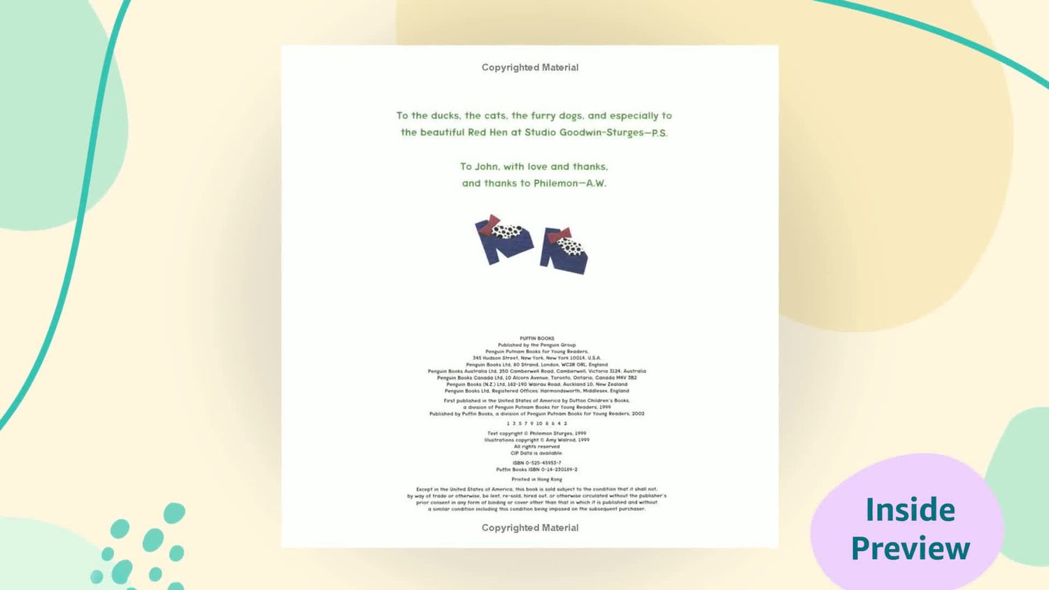 Details: The story of the industrious Little Red Hen is not a new one, but when this particular hen spies a can of tomato sauce in her cupboard and decides to make a pizza, the familiar tale takes on a fresh new twist. Kids will love following along as the hen, with no help from her friends the duck, the dog, and the cat, goes through the steps of making a pizza-shopping for supplies, making the dough, and adding the toppings. But despite their initial resistance, the hen's friends come through in the end and help out in a refreshing and surprising way.