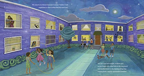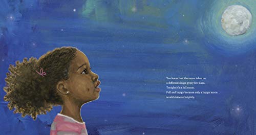 This lyrical text, narrated to a young girl named Amani by her father, follows her as she plays an evening game of hide-and-seek with friends at her apartment complex. The moon's glow helps Amani find the last hidden child, and seems almost like a partner to her in her game, as well as a spotlight pointing out her beauty and strength.
